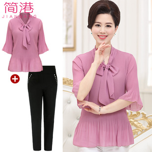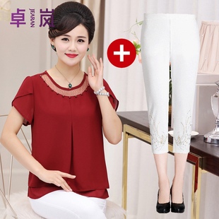 中老年人妈妈夏季套装女装雪纺上衣+七分裤