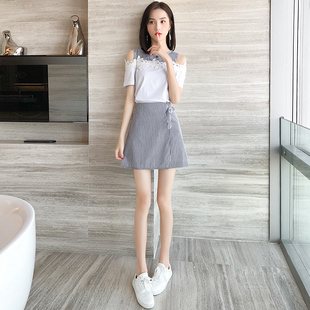 漏肩连衣裙学院风心机显瘦条纹套装裙